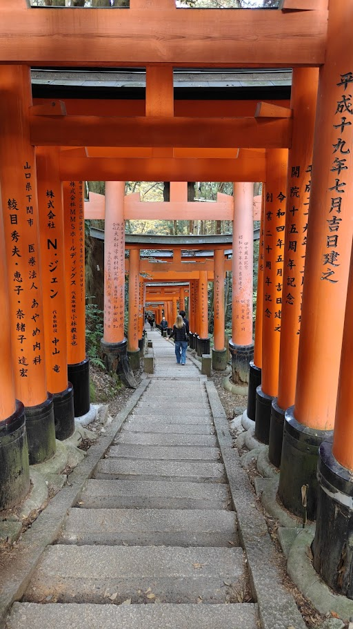 J’ai beaucoup monté et aussi descendu d’escalier cette journée. Plus j’avance et moins il y a de monde jusqu’à me retrouver seul ou presque. La quiétude des lieux est extraordinaire. On est concentré sur la marche et sur chacun des quelques 10 000 torii, installés tout au long des différents chemins à emprunter. De plus petits sanctuaires se trouvent à différents endroits. Il y a un côté magique en plus du mystique.