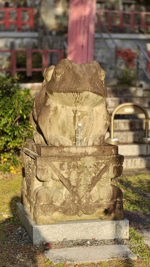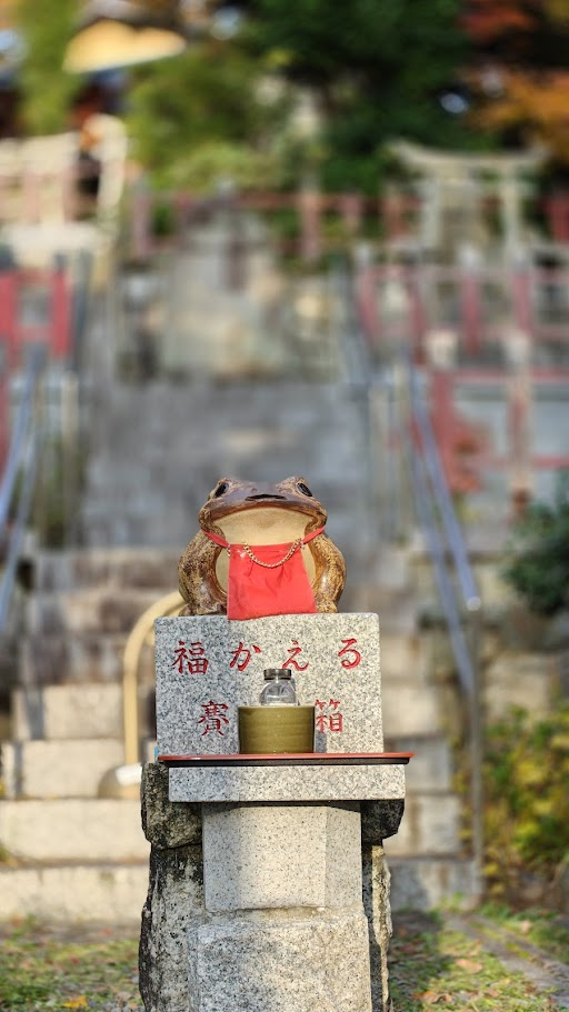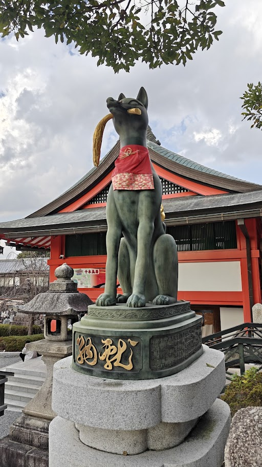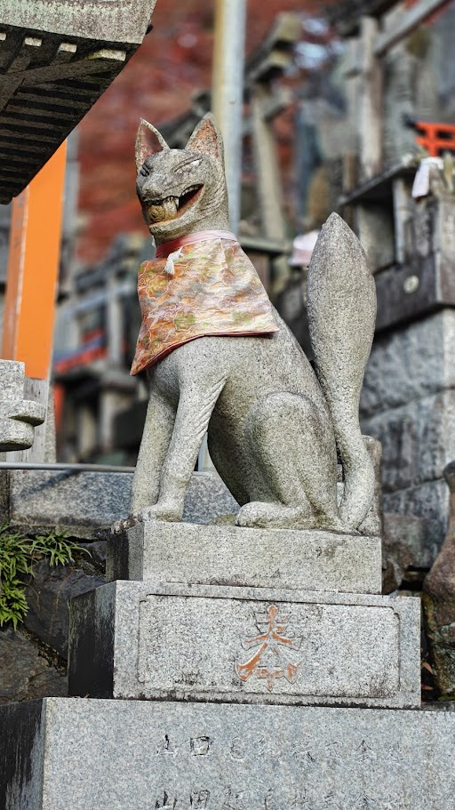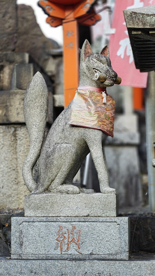 Dans la religion shintoïste, le renard est considéré comme le messager d’Inari, la divinité des céréales (riz), du commerce et de la prospérité. On les voit souvent par paires, représentant les principes du yin et du yang. De nombreuses statues tiennent un objet dans leur gueule : ici un épis de riz (son miroir qui n’apparait pas sur la photo tenant un parchemin) symbolisant la connaissance. Les fidèles placent souvent des bavoirs rouges, appelés yodarekake autour de leur cou en signe de dévotion ou pour demander une protection.