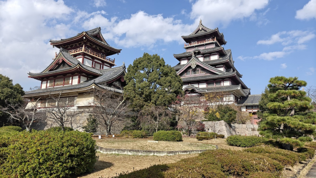 Aujourd’hui, le bâtiment n’est pas l’original, mais une reconstruction en béton datant de 1964. Elle a été édifiée pour un parc d’attractions (aujourd’hui fermé) à proximité du tumulus impérial de l’empereur Meiji. Bien que ce ne soit pas une structure historique authentique, sa silhouette massive et ses ornements dorés offrent une vision spectaculaire de l’esthétique grandiose de l’époque de Hideyoshi.