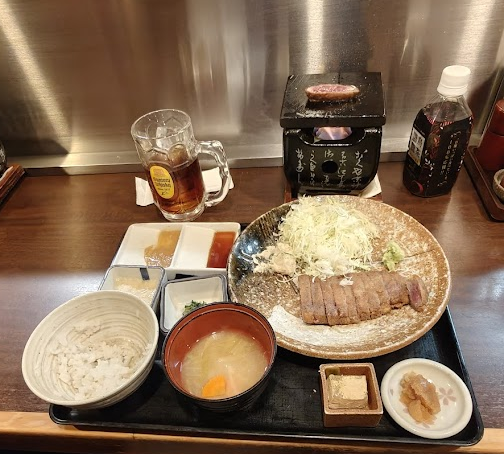 Le repas est composé, d’une soupe, de tranches de bœuf panées, de riz, d’un peu de salade, de différentes sauces et d’un petit barbecue personnel pour réchauffer chaque tranche. En guise de boisson, un thé froid.
