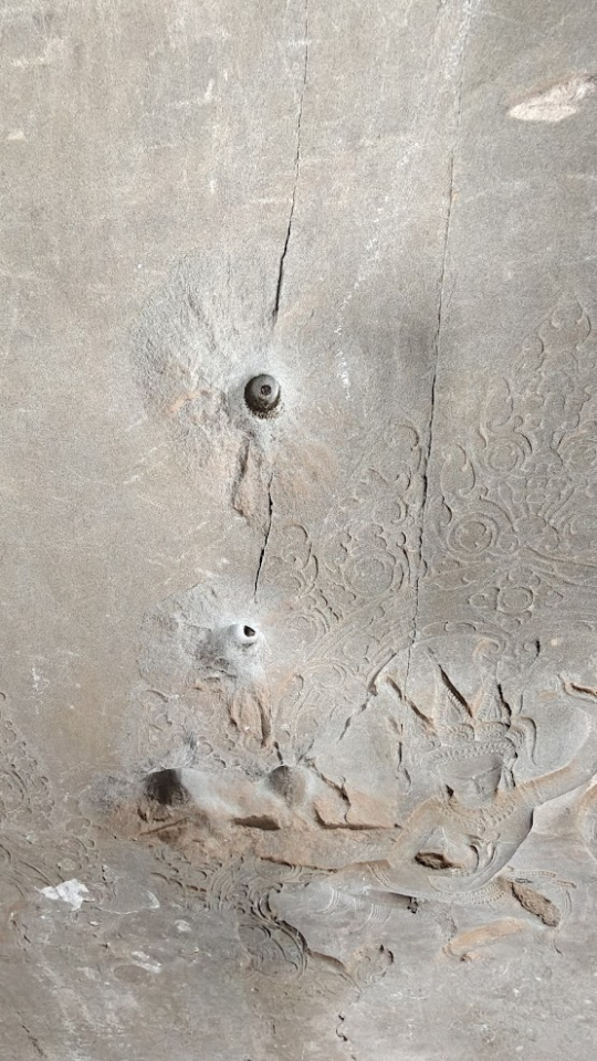 Dans les murs du temple on trouve encore les balles tirées lors d’une fusillade entre Khmer rouges et Vietnamiens.