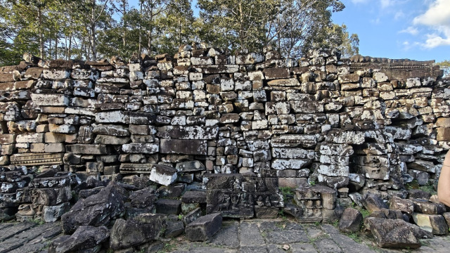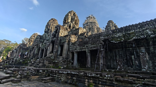 Nous dirigeons ensuite vers le temple Bayon, Lui aussi un temple montagne. Petite particularité, les étages de ces temples, construits en haut d’une pyramide, ont toujours un nombre impair d’étages.