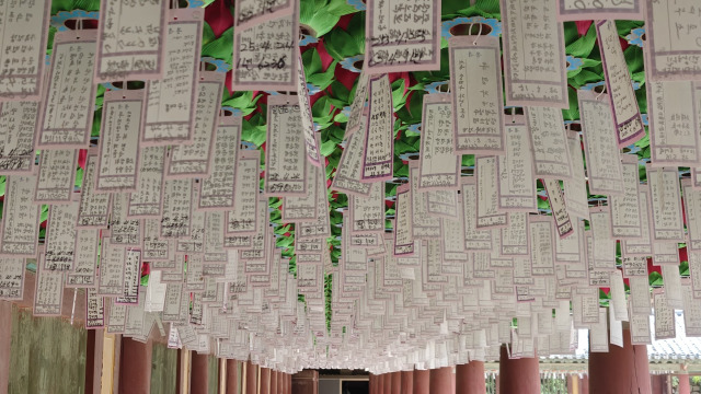 A l’intérieur, les plafonds des longs couloirs qui permettent de naviguer dans le temple à l’abris des intempéries sont recouverts de prières.