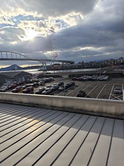 On prend un bus qui nous emmene de l’autre côté de l’usine en passant par un pont dont notre guide nous explique fièrement que c’est une route privée et propriété de Mazda.