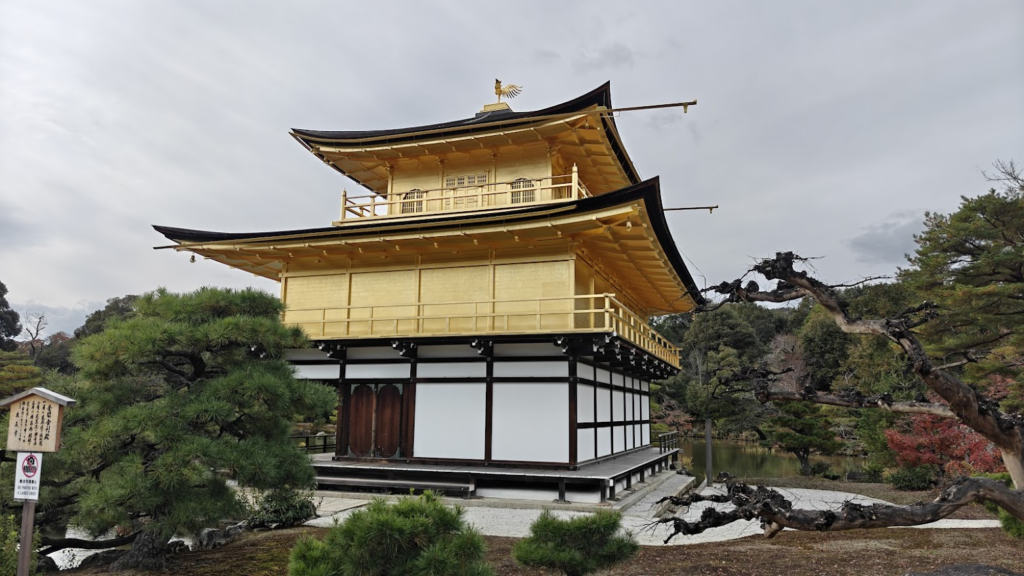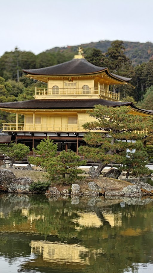 L’originalité du pavillon réside dans sa structure hybride où chaque étage adopte un style architectural distinct. Le rez-de-chaussée évoque l’élégance des palais impériaux, le premier étage rappelle la sobriété des demeures de samouraïs, et le dernier niveau s’inspire de l’esthétique épurée des temples zen. Les deux étages supérieurs, recouverts de feuilles d’or pur, se reflètent dans les eaux de l’Étang Miroir qui l’entoure, créant une vision de paradis bouddhiste sur terre.