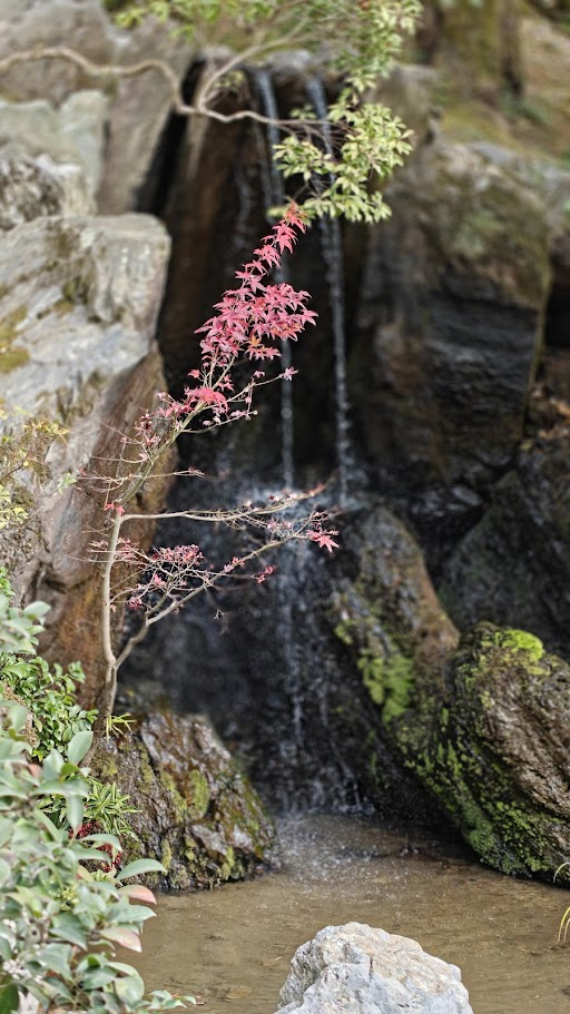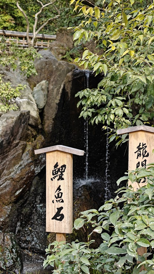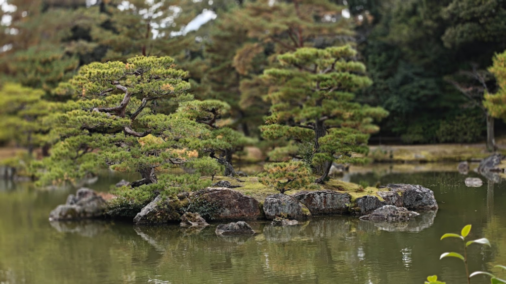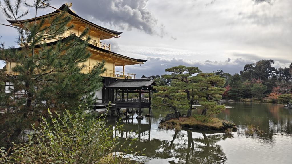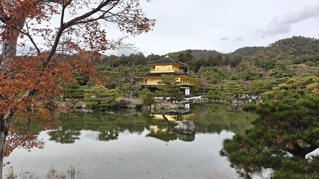 Le parc du Kinkaku-ji entoure l’Étang Miroir, dont la surface calme démultiplie l’éclat du pavillon d’or au milieu d’îlots de pins et de pierres sacrées. Ce jardin zen de promenade, conçu comme une image du paradis bouddhique, nous guide entre mousses épaisses, sources rituelles et une cascade symbolisant la persévérance. Le sentier s’élève ensuite vers un pavillon de thé rustique qui incarne l’esthétique du dénuement, offrant un contraste avec le faste des étages dorés. Les couleurs automnales se mêlent parfaitement avec les lieux.