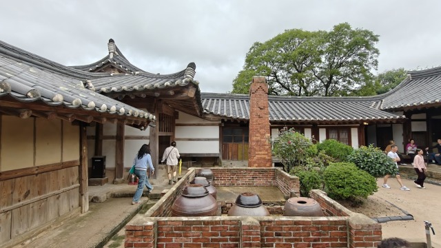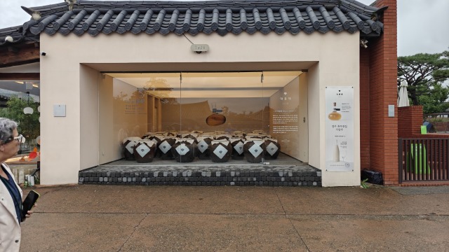 Comme vous pouvez le voir sur cette photo, dans l’espace cuisine se trouve un Jangdokdae, espace dédié des onggi, sorte de jarre en terre cuite. D’après Wikipédia, “elles sont utilisées pour faire fermenter ou simplement stocker des aliments tels que le kimchi, gochujang (pâte de piment), le doenjang (pâte de soja) et la sauce de soja.” Ainsi les aliments pouvaient être gardés plusieurs années.