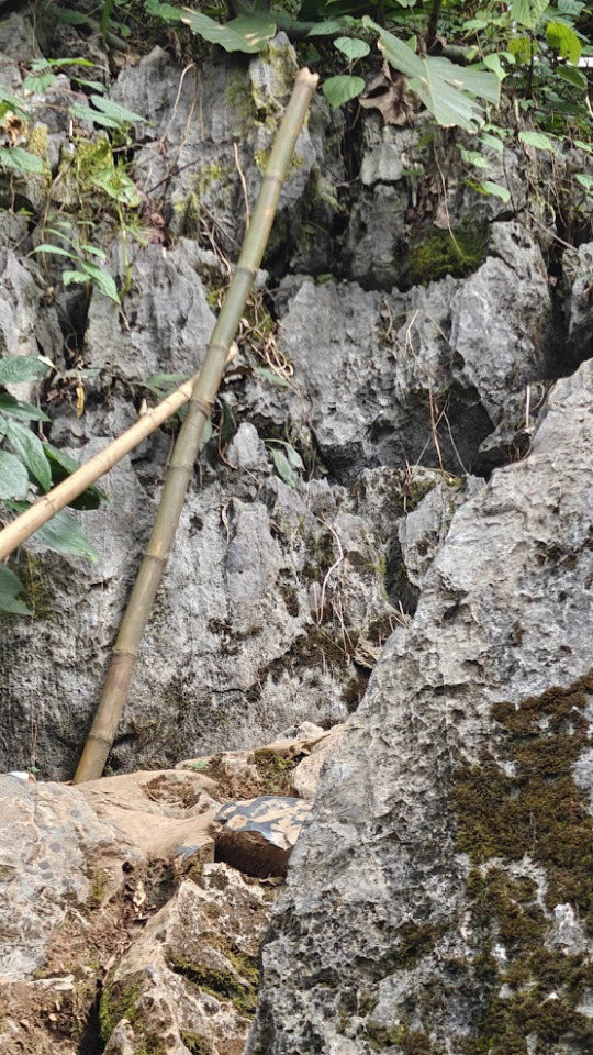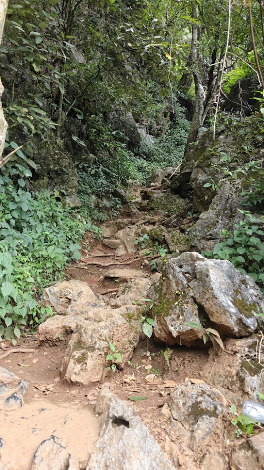 un peu plus loin il y a un chemin menant à une grotte que je décide d’emprunter. Je me retrouve dans un bourbier et arrive devant une sorte d’échelle en bois pourri menant à une grotte. Je me retrouve avec deux françaises avec qui, d’un commun accord, décidons que la vie est trop belle pour tenter d’entrer là dedans. J’en profite pour me flinguer le tibia sur un caillou lors de la descente. Pas génial mais bon.