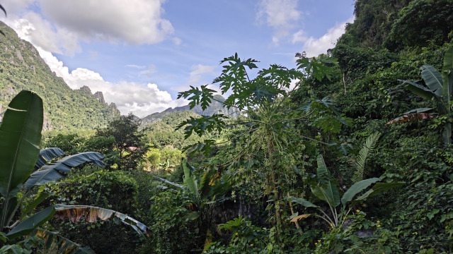 Réveil nuageux à Vang Vieng. Je me prépare pour ma journée de visite et de marche.