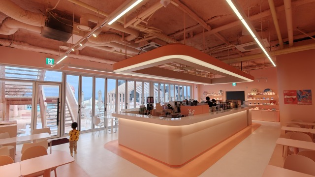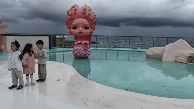 Au sommet du bâtiment, un bar (un café) très girly avec une sirène sur une terrasse. Les enfants adorent visiblement !