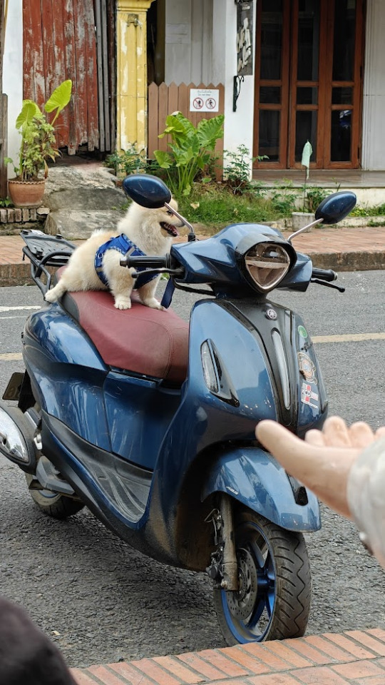 Un chien vient chercher ses croissants en Scooter. Ils sont vachement bien dressés ici.