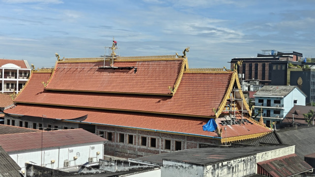Je retourne à mon hôtel d’où je peux admirer un temple en construction et du toit la piscine donnant sur la ville